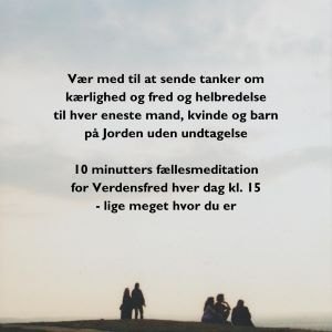 Så uanset hvor du måtte befinde dig, vil vi gerne invitere dig til at stoppe op hvis du kan og meditere sammen med os for Verdensfred og Helbredelse. Ved at gøre dette så ofte som du kan, kan du være med til at gøre en forskel. Hvis du ikke har mulighed for at gøre det hver dag, så gør det når du kan. Du kan sidde ned, stå eller gå, ligge ned eller endda køre i bil mens du gør dette. Det er dit fokus der tæller – det er følelsen af KÆRLIGHED i dit hjerte der tæller! Så hver dag kl. 1500 håber vi du vil gøre os følgeskab og sende tanker om KÆRLIGHED OG FRED OG HELBREDELSE TIL HVER ENESTE MAND, KVINDE OG BARN PÅ PLANETEN JORDEN UDEN UNDTAGELSE. SE FREDENS OG HARMONIENS VIRKELIGHED UDFOLDE SIG FOR DIT INDRE ØJE I DETTE ØJEBLIK. FØL KÆRLIGHEDEN TIL DINE MEDMENNESKER UANSET HVOR DE MÅTTE VÆRE! Tak tak tak for alt det Gode som du gør – hver eneste dag – for at gøre denne verden til et bedre sted! Planeten Jorden har brug for at vi alle arbejder sammen nu for at løfte den kollektive bevidsthed! Når vi arbejder sammen, har vi så meget mere kraft! Mange velsignelser til jer alle! Barbara